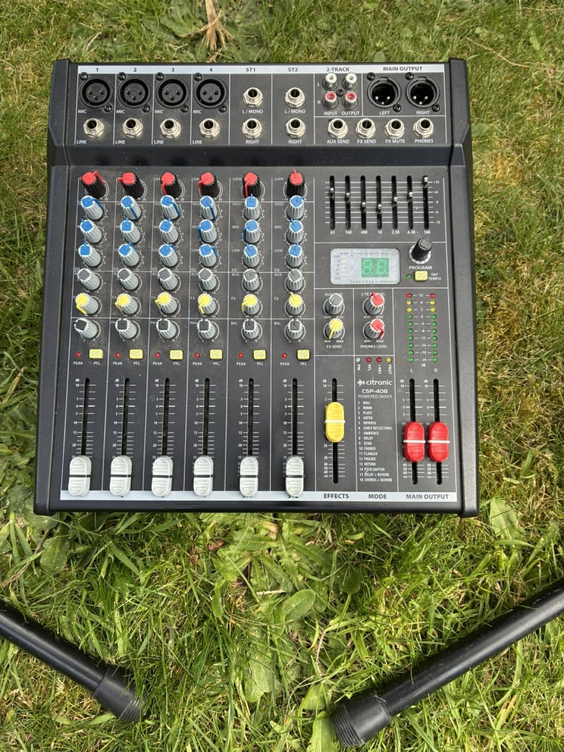 The 6 Channel mixer with built in Amplifier comes with 2 speakers with Stands, 2 Microphones with Stands and free delivery and set up within a 10 mile radius of our Worthing base.